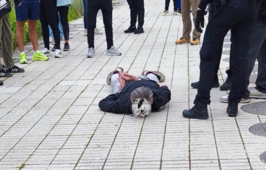 Photos shared online show the grey-haired suspect laying face down on the ground with his hands behind his back.