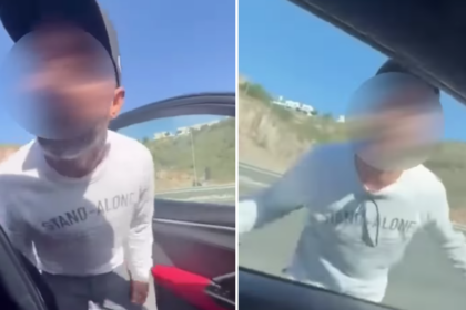The clip shows two men in hoods approaching parked cars outside a property.