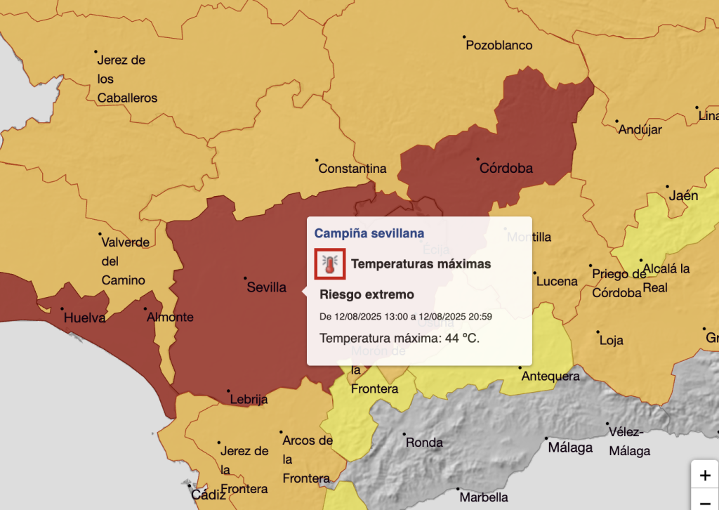 The most severe warning possible has been issued for the whole province of Sevilla, and the majority of Huelva and Cordoba.