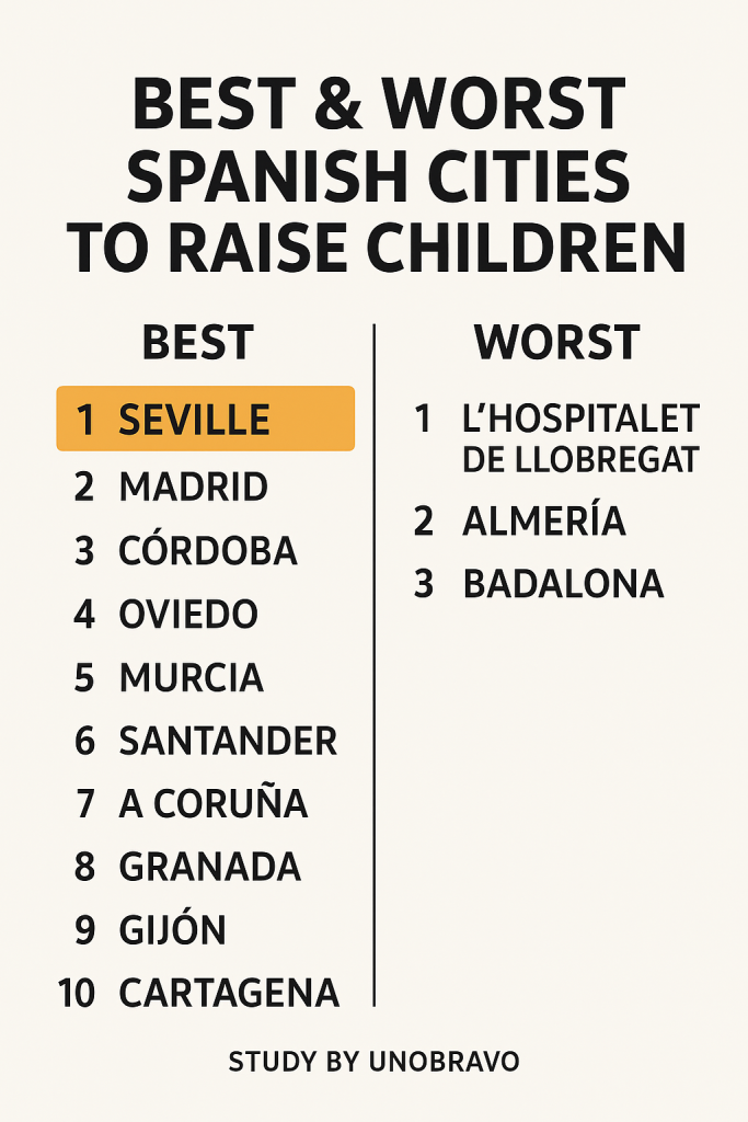 At the other end of the scale, L’Hospitalet de Llobregat and Badalona in Barcelona province, along with Almería, were named the least favourable for families – citing higher crime, poorer healthcare access, and limited public childcare.