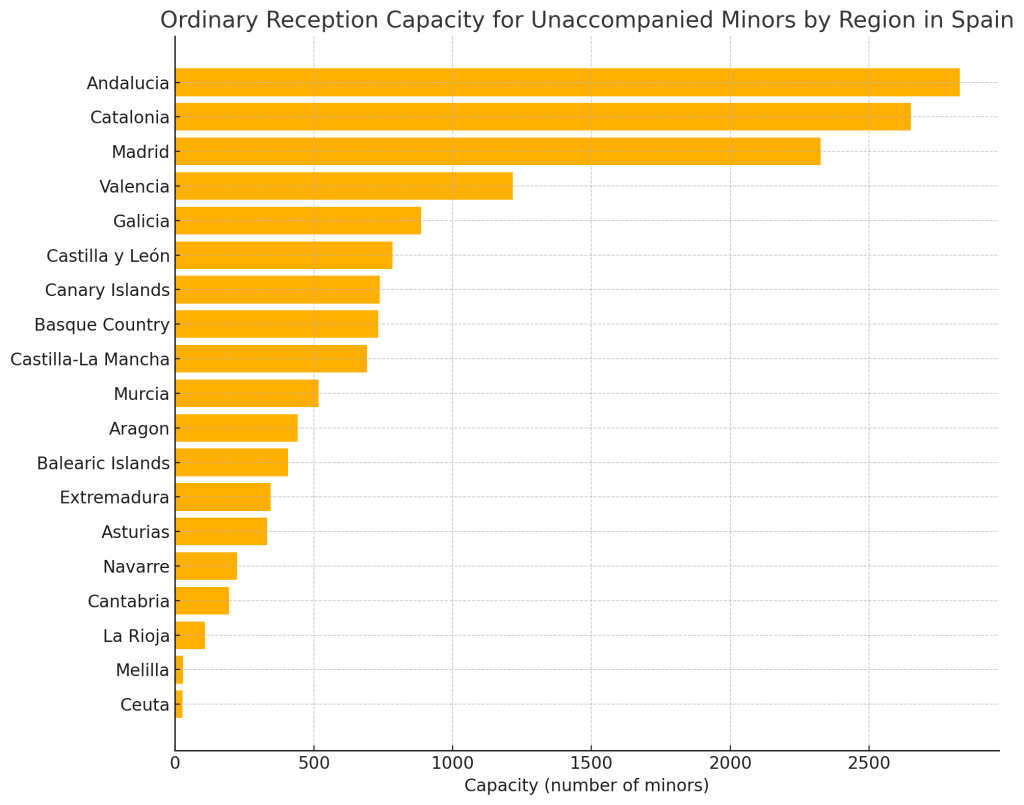 According to the decree, the ordinary reception capacities by region are: Andalucia (2,827), Catalonia (2,650), Madrid (2,325), Galicia (886), Aragon (441), Asturias (331), Balearic Islands (406), Canary Islands (737), Cantabria (194), Castilla y Leon (783), Castilla-La Mancha (692), Extremadura (344), Murcia (517), Navarre (223), Basque Country (731), La Rioja (107), Ceuta (27), and Melilla (28).