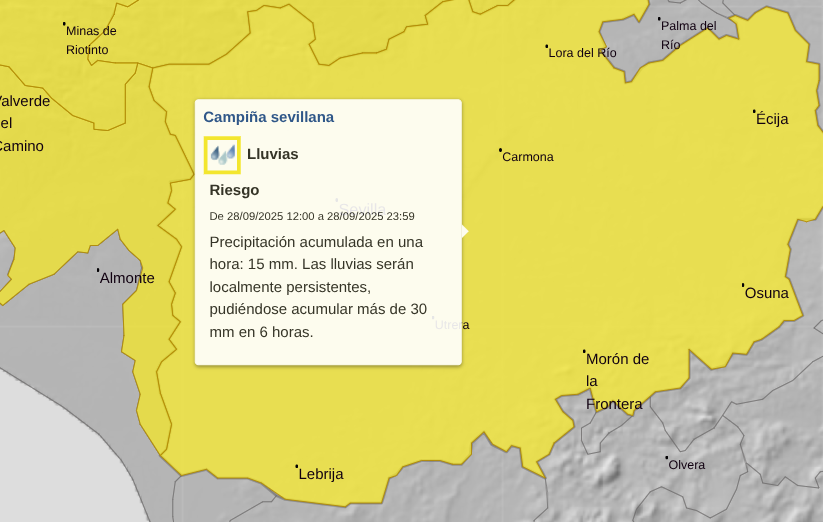 The alerts cover areas including the Sierra de Aracena, Andevalo, Condado and the majority of Sevilla province, including the capital.