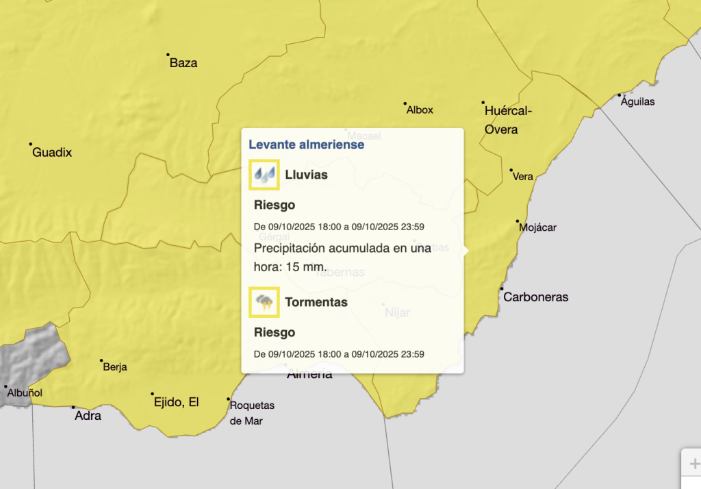 On this day, the majority of Almeria province will be under a yellow advisory between 6pm and 11.59pm.