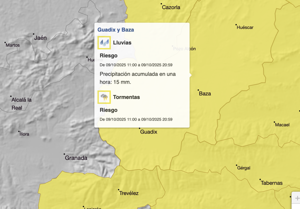 The affected areas in Granada are Guadix and Baza, and the Sierra Nevada and Alpujarras.