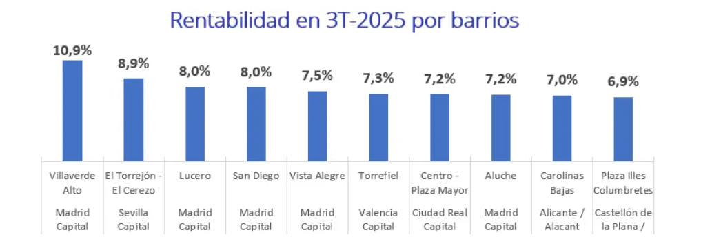 All of the above post returns above the national average of 6%. Notably, Espinardo in Murcia jumped two full points in one year, from 5.6% in Q3 2024 to 7.6% now.