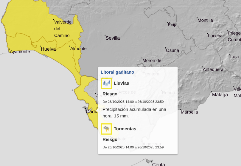 The yellow warnings, issued by state weather agency Aemet, cover parts of Huelva, Cadiz and Almeria.