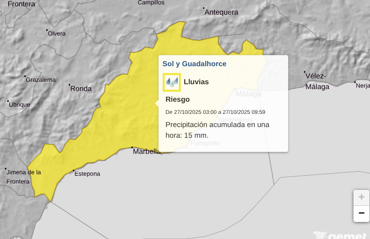 State weather agency Aemet issued a yellow warning for the Costa del Sol and Guadalquivir Valley on Sunday evening.