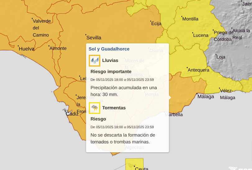 According to state weather agency Aemet, up to 30mm of rainfall could fall on multiple areas, including the Costa del Sol, Guadalhorce Valley and Ronda.