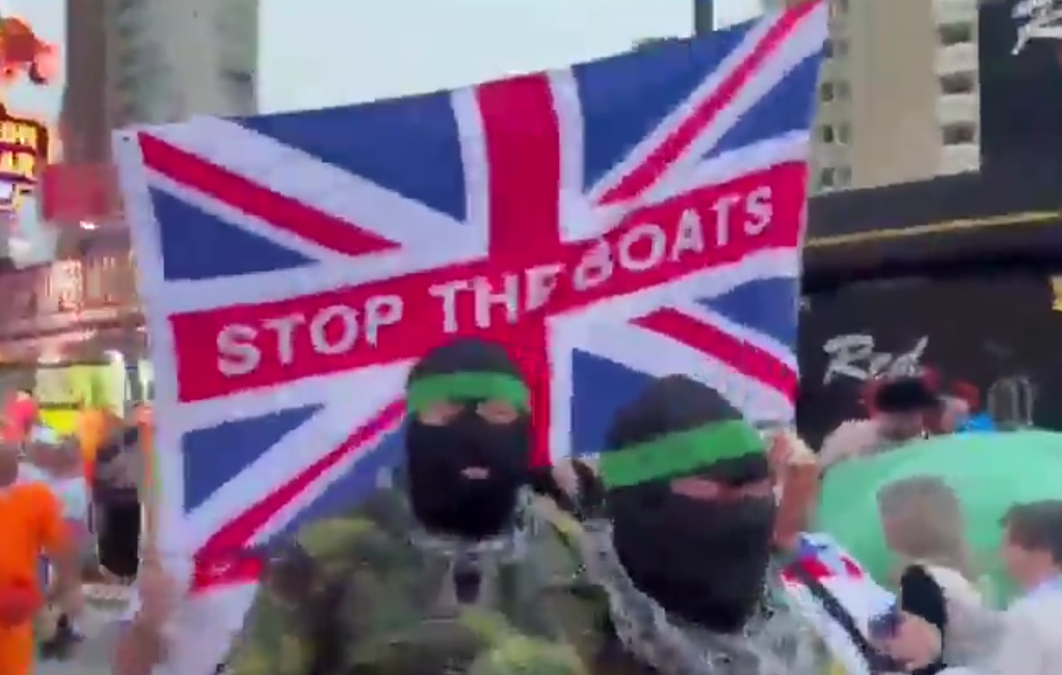 They are seen holding up Union Jack flags with the words ‘Enough is enough: Stop The Boats’ emblazoned on them.