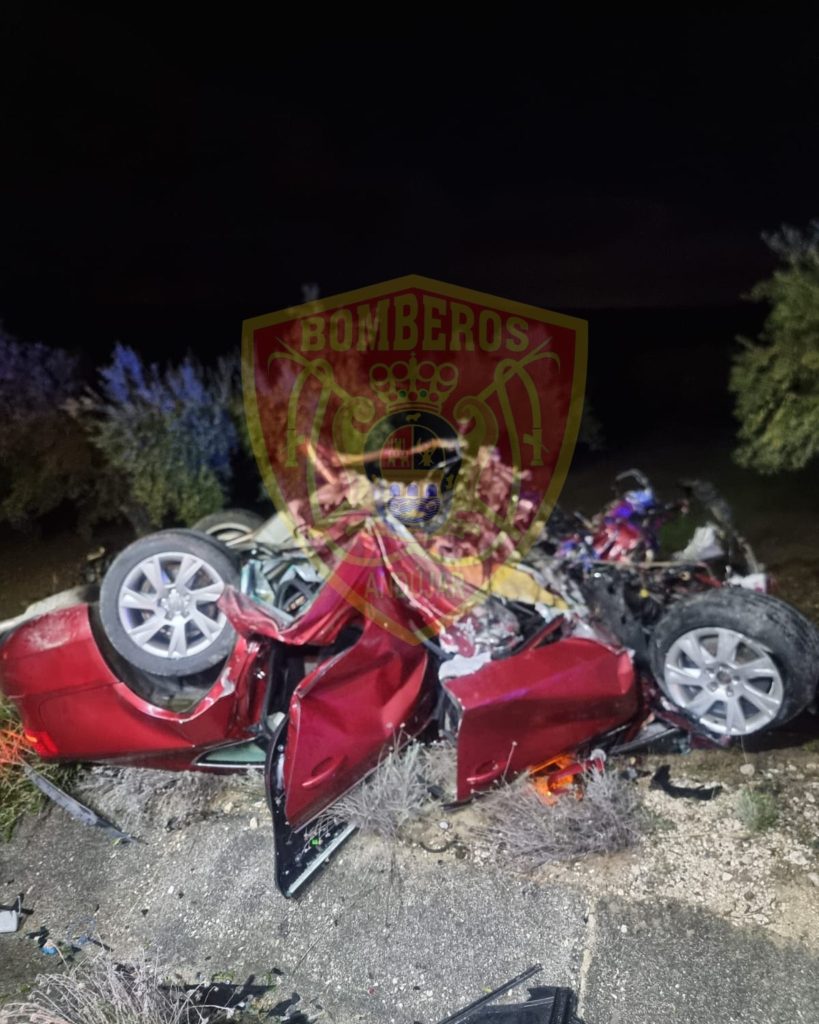 A photo shared by Andujar firefighters (Bomberos de Andujar), shows how a red vehicle was left totally crushed upon veering off the A-306.
