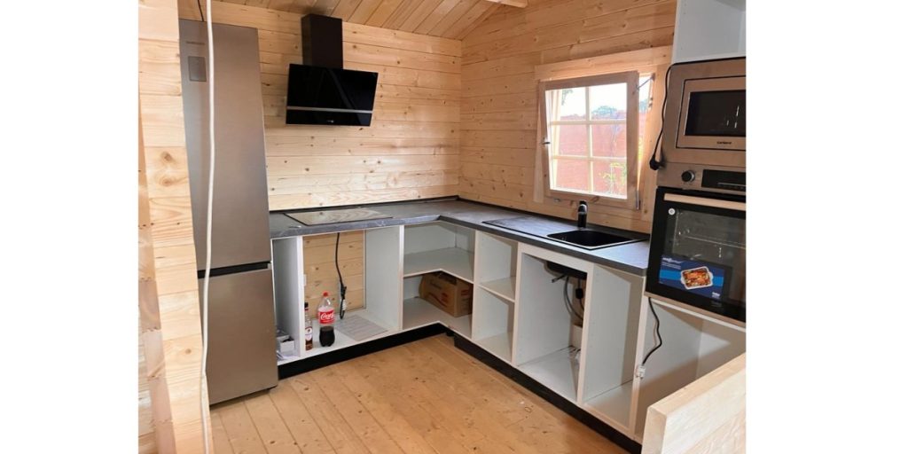 The wooden home comes with two bathrooms and an open-plan living room and kitchen.