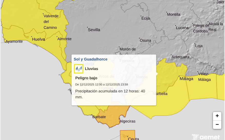 The Costa del Sol and Guadalhorce region, including Malaga city, Marbella and surrounding areas, will sit under a yellow alert for rainfall, with up to 40mm expected in 12 hours.