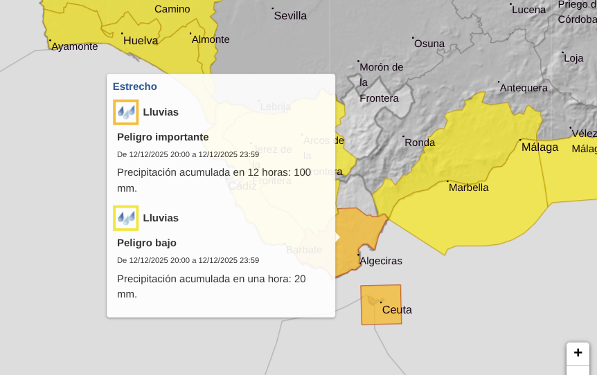 The ‘Estrecho’ region of Cadiz is the only area under an orange alert – meaning significant risk – due to heavy rainfall.
