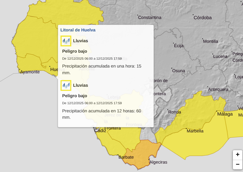 The coast of Huelva will be under yellow alerts throughout Friday, with up to 15mm of rain expected in one hour, and 60mm over 12 hours.