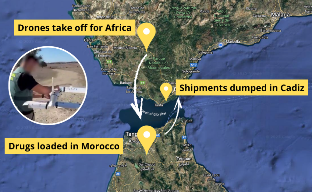 The adapted drones were able to take off from the town, fly across the Strait of Gibraltar, collect packages of hashish in northern Morocco, and drop them back into Spain between Tarifa and Vejer de la Frontera, before returning to base.