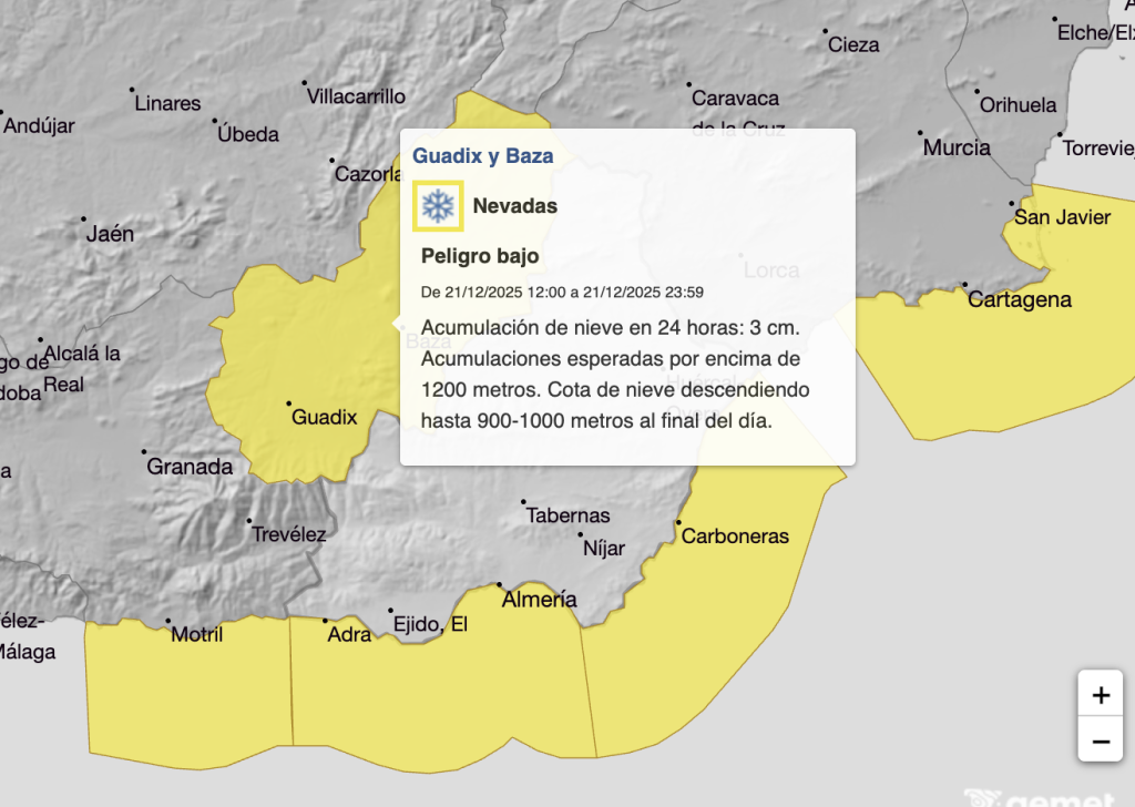 According to the alert, which covers Guadix and Baza, up to three centimetres of the white stuff could accumulate over a 24-hour period.
