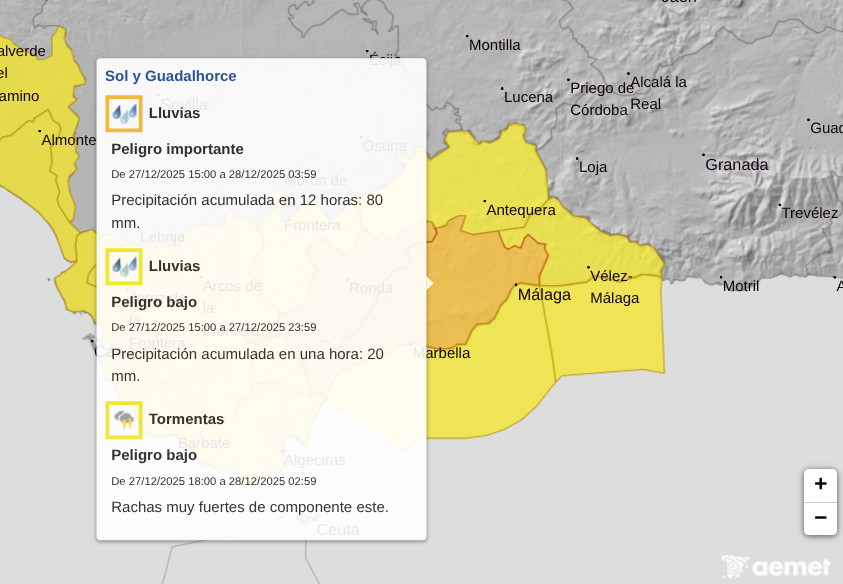 The orange warning from state weather agency Aemet covers the Costa del Sol, Guadalquivir Valley and Ronda areas.