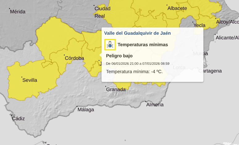 The yellow warnings, beginning at 9pm and ending on Wednesday morning, affect the Sevilla countryside, Cordoba, most of Jaen and Guadix and Baza in Granada.