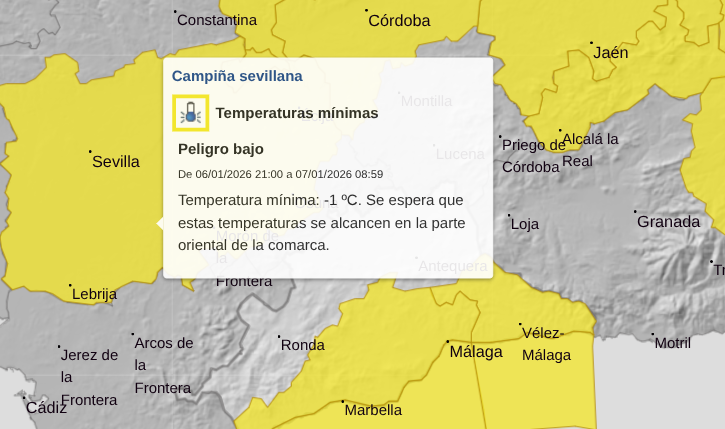 Aemet is warning of lows of -1C overnight, with the eastern half of the Sevilla countryside to be the most affected.