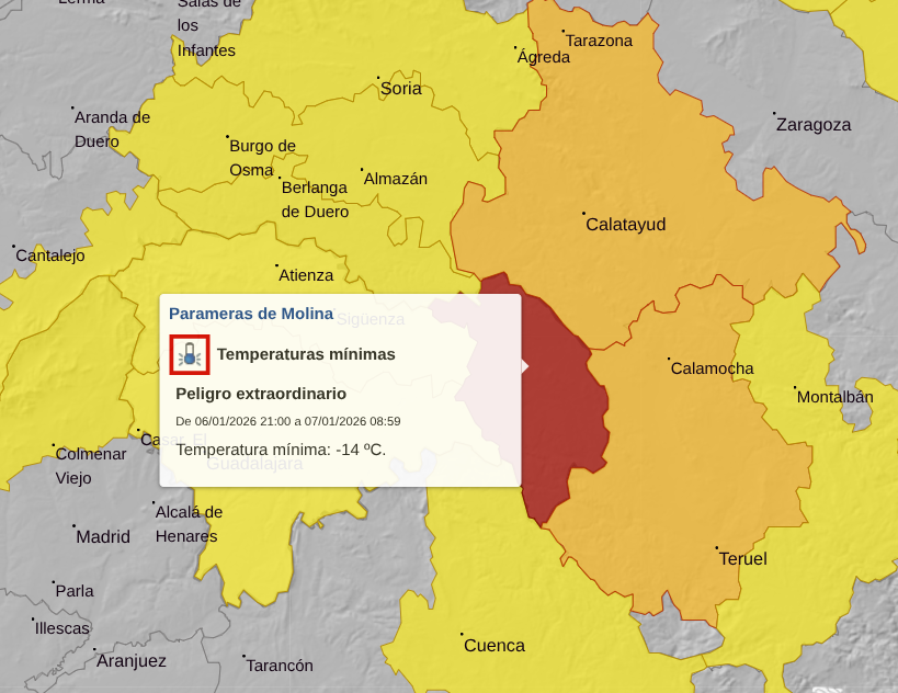 The most severe conditions are in Parameras de Molina, Guadalajara, where a red alert has been issued for lows of -14C.