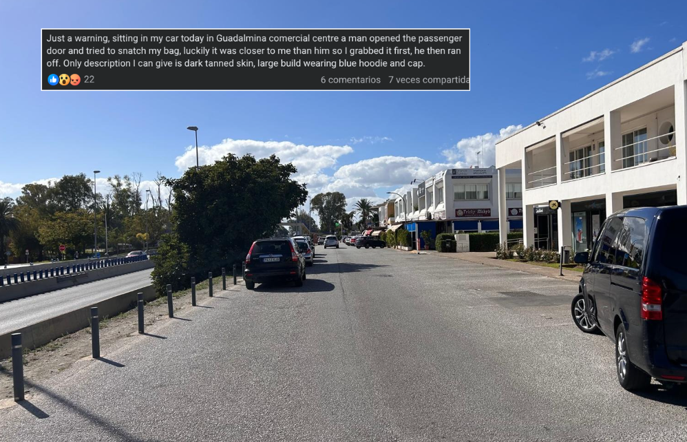 Emma wrote: ‘Just a warning, sitting in my car today in Guadalmina commercial centre when a man opened the passenger door and tried to snatch my bag.