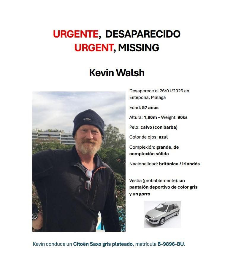 Kevin Walsh, 57, was last seen in Estepona, according to an appeal published on social media networks.