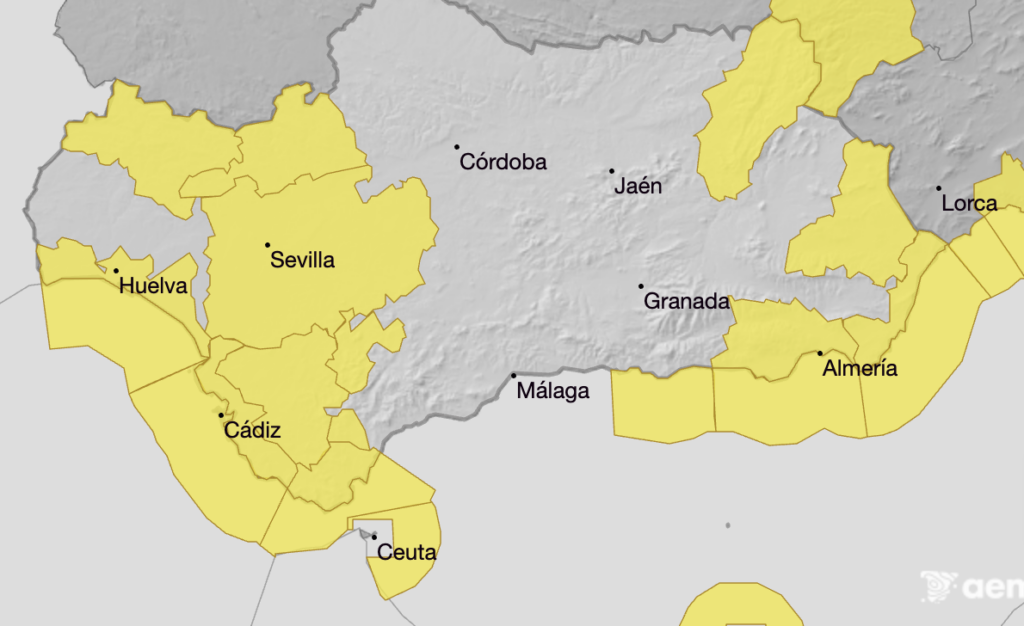 The alert has been issued by state weather agency Aemet and affects the whole Atlantic coast of Huelva and Cadiz.
