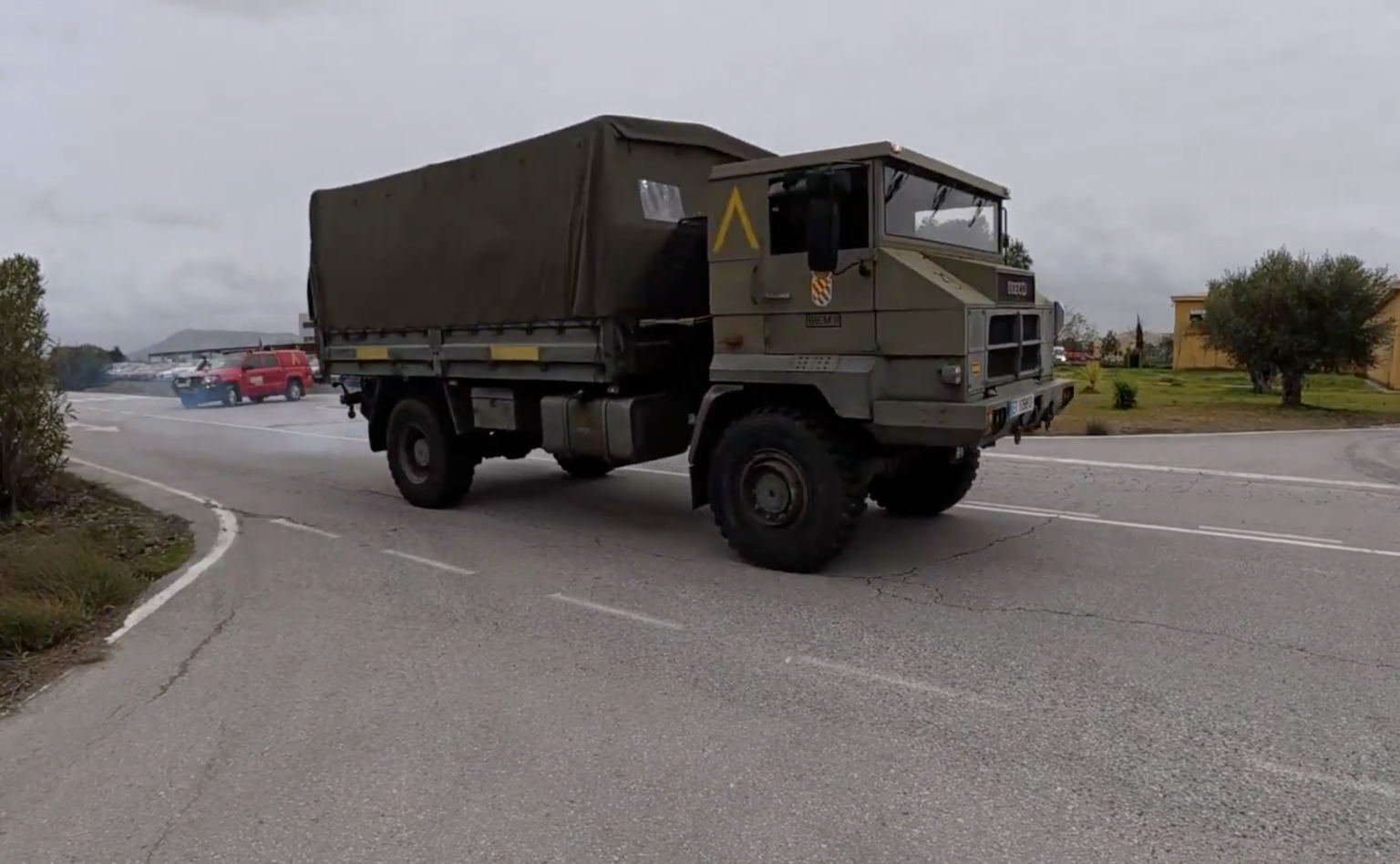 The heavy duty trucks were seen driving out of the military compound in Moron, a municipality in Sevilla province.