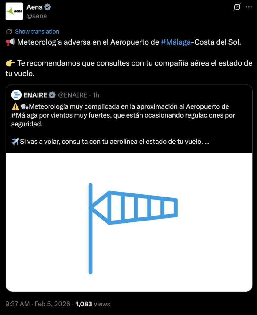 ENAIRE added: ‘Very complicated meteorology in the approach to Malaga Airport due to very strong winds, which are causing regulations for safety reasons.