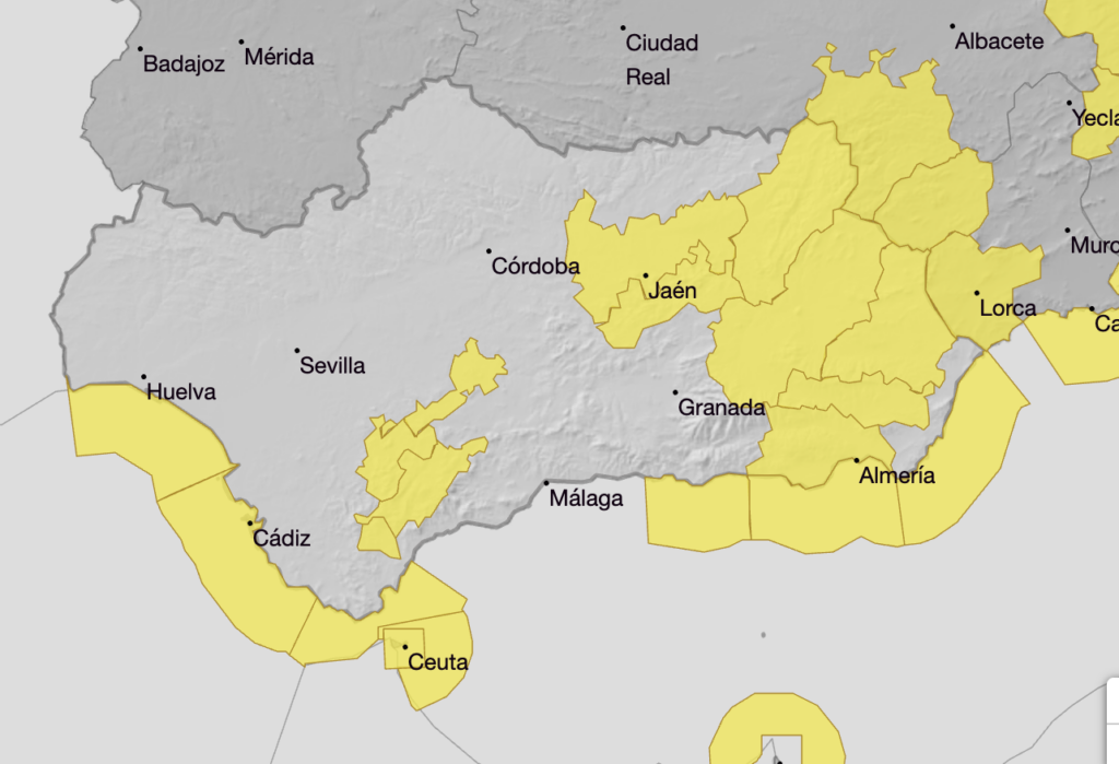 Elsewhere, yellow warnings for winds of up to 70km/hr are in effect for the majority of Almeria and inland areas of Granada, plus much of Jaen province.