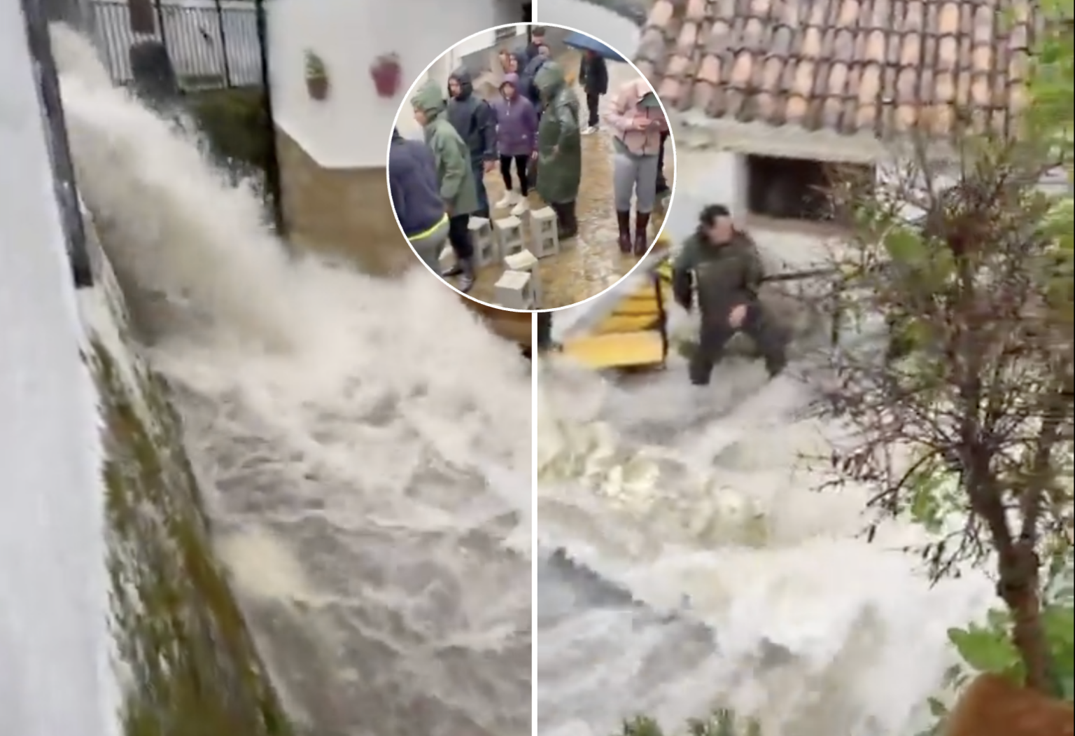 This is the desperate moment locals in Jubrique were filmed throwing sandbags onto a street in a bid to stop a torrent of water from invading their homes.
