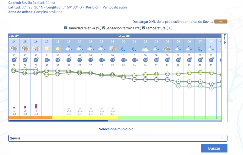 This link here, for example, shows the rainfall predicted in Sevilla by the hour. You can change the municipality to look in your own area.