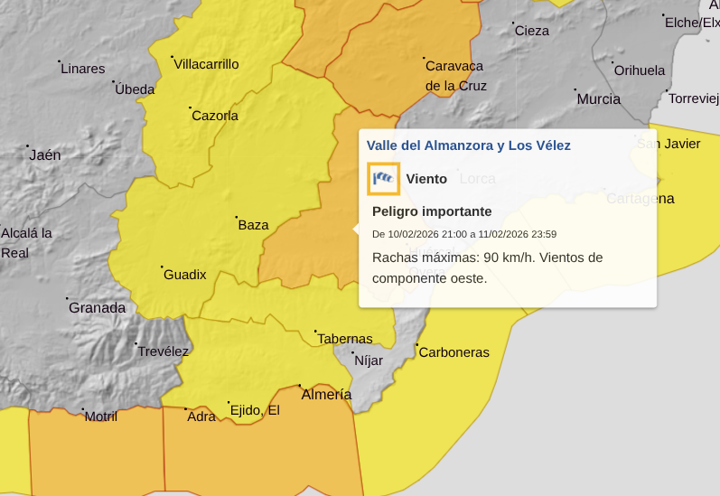 In Almeria, an additional orange wind warning will be active between 9pm and midnight, with gusts potentially reaching 90km/hr.
