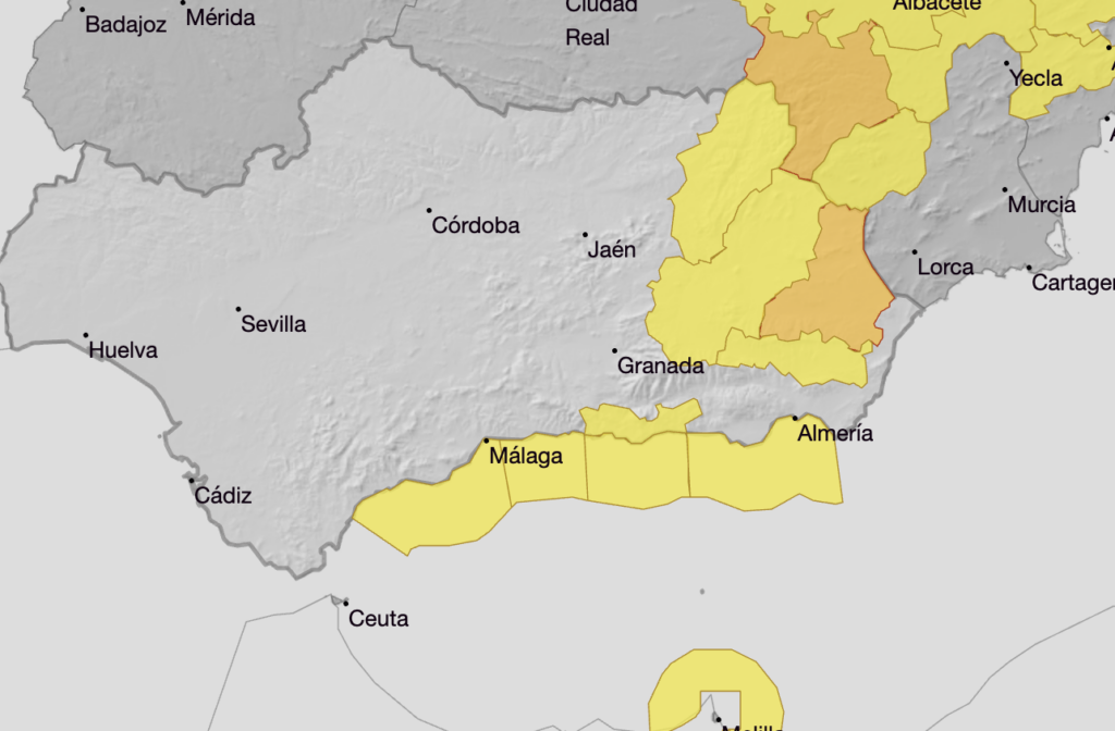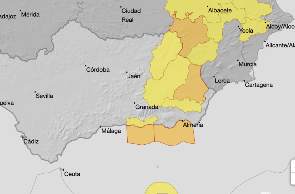 Meanwhile, inland Granada (Guadix and Baza) and Carzola and Segura (Jaen) are on a yellow alert both days for 80km/hr gusts.