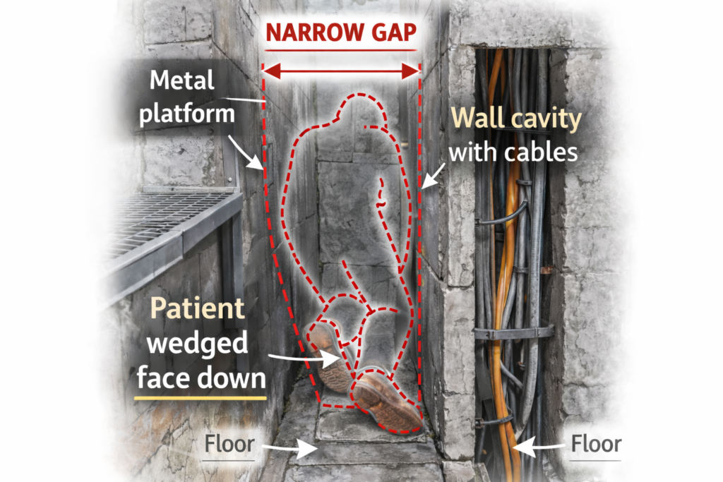 One line of investigation suggests the patient may have entered the area to retrieve a personal belonging and became trapped face down, unable to free himself.