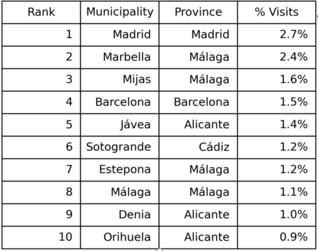 Marbella topped the list overall, followed by Madrid and Barcelona. Other popular areas include Mijas, Estepona, Benalmadena and Benahavis on the Costa del Sol, as well as coastal Alicante towns such as Denia, Altea, Moraira and Calpe.
