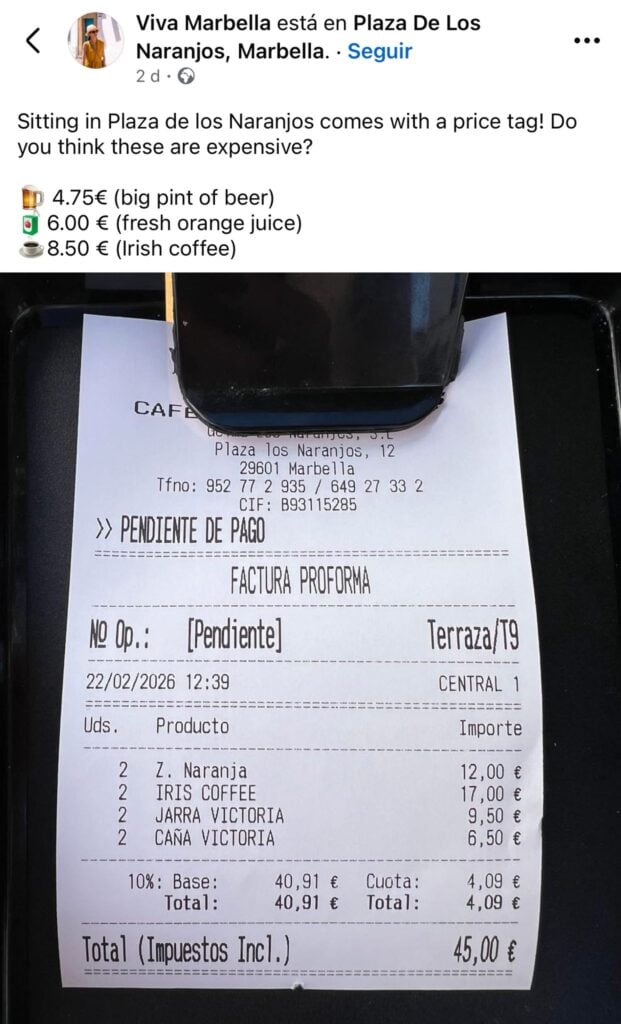 Lucia, from local guide page Viva Marbella, shared a photo of her bill after she enjoyed some drinks in the iconic Plaza de los Naranjos.