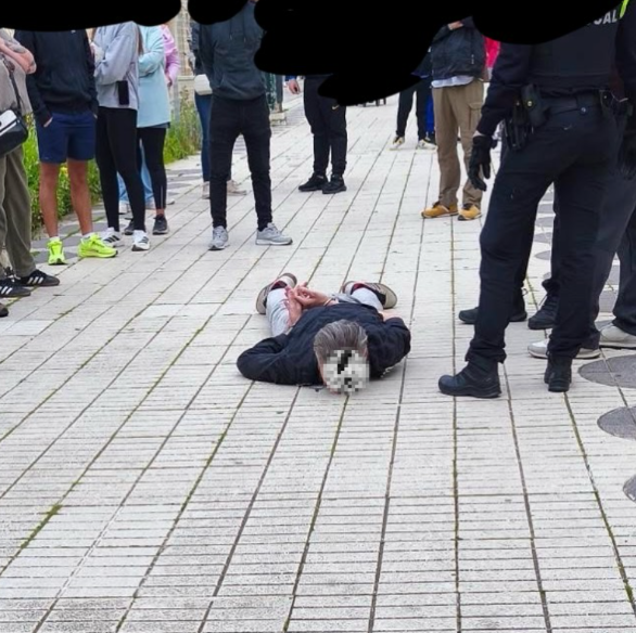 Policia Local officers can be seen standing above him while a crowd of people have gathered round.