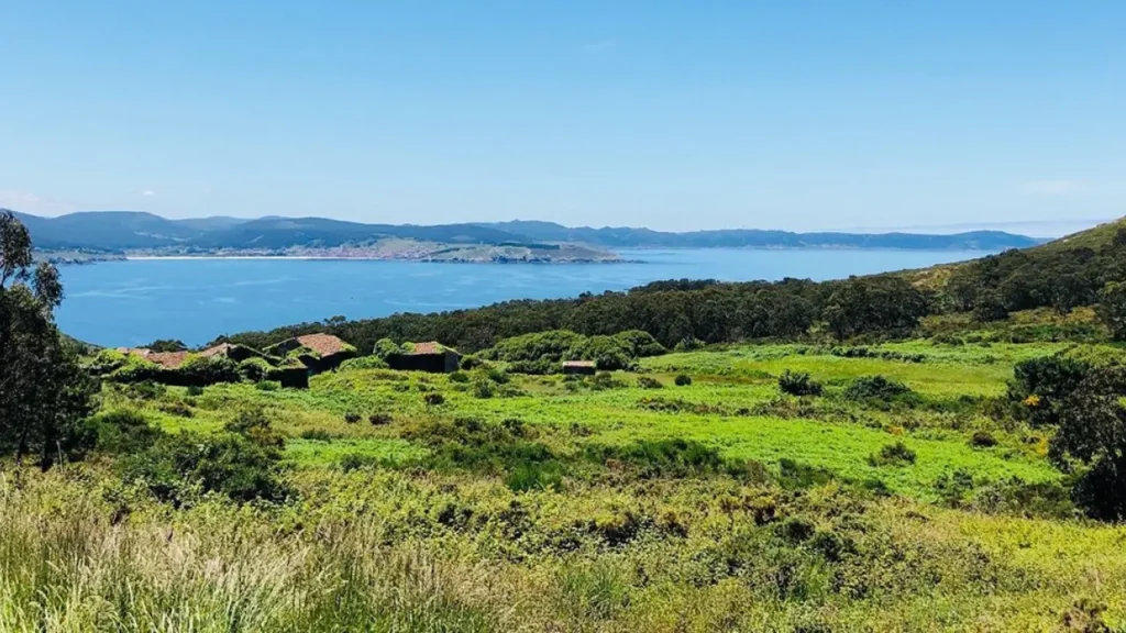 From the village there are sweeping views across the rugged Costa da Morte landscape, with dense greenery and coastal scenery all around.