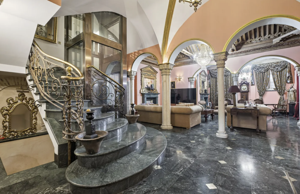 Guests are welcomed into a grand living room with high vaulted ceilings, marble pillars and a large fireplace. A sweeping marble staircase with a gold-toned balustrade takes centre stage, alongside a private lift and a guest toilet.