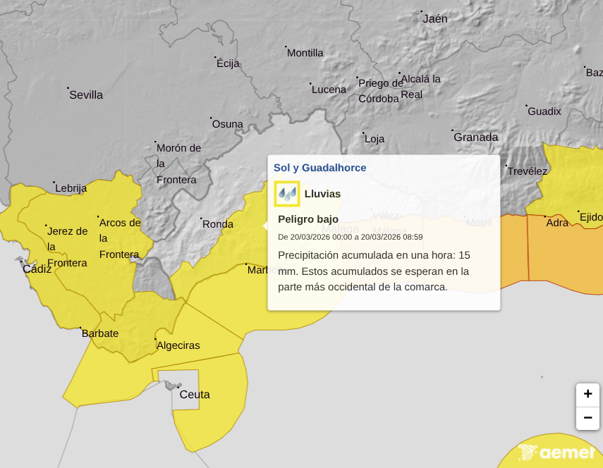 Some rainfall could be intense, with up to 15mm of rain in just one hour in parts of Cadiz.