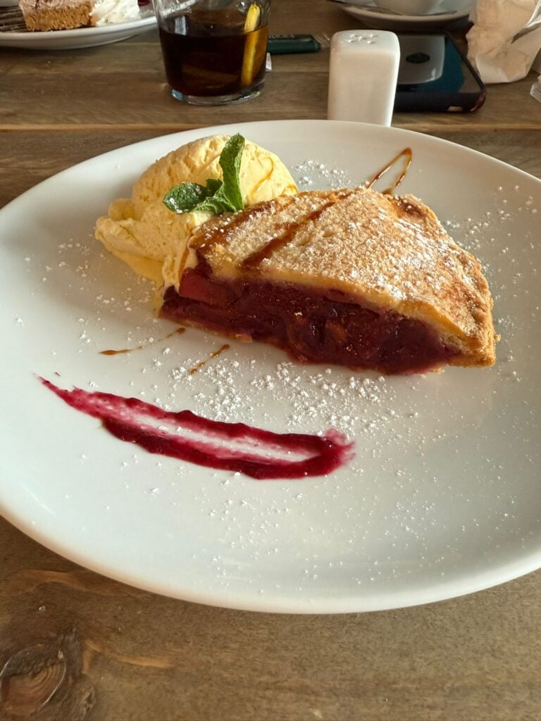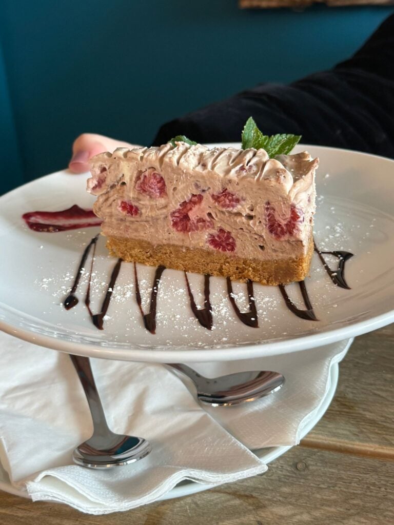 Everything is homemade, and it shows. The mixed chocolate cheesecake with raspberries is heavenly, while the mixed fruit baked pie is a treat for lovers of sweet.