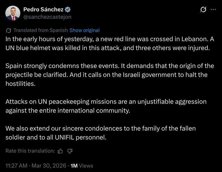 Pedro Sanchez has issued a stern statement after deadly attacks on UN peacekeepers in Lebanon, declaring a ‘red line’ has been crossed.