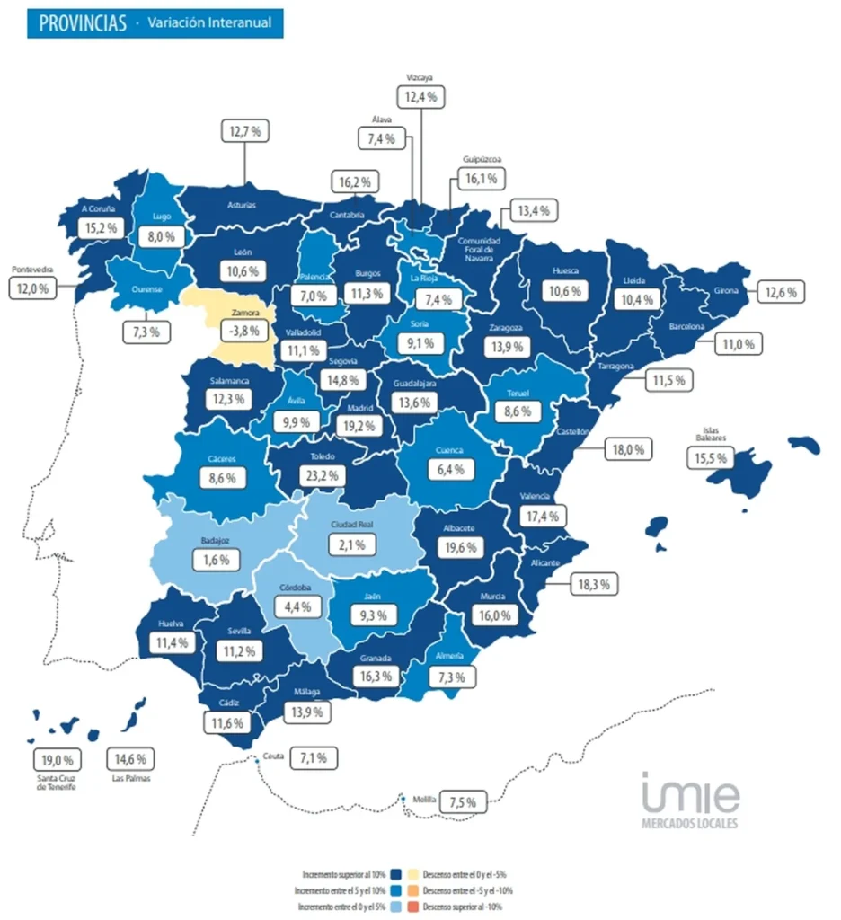 Tinsa reports that across Spain prices are rising in 40 out of 52 provinces, with increases above 10% in 34 of them, particularly in Madrid, coastal regions and island markets.