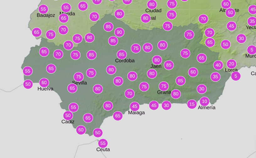 Current forecasts from Aemet put the probability of rainfall in Andalucia on Tuesday at between 30% and 90%, depending on the area.