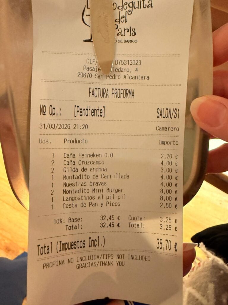 The cañas for just €2 might not sound remarkable elsewhere, but in Marbella in 2026, it absolutely is.