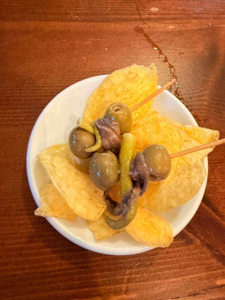 We ordered a spread that would comfortably satisfy two – four beers, two gildas, generous plate of patatas bravas, a montadito de carrillada, two mini burgers and a sizzling prawn pil-pil – and the bill came to just €35.70.