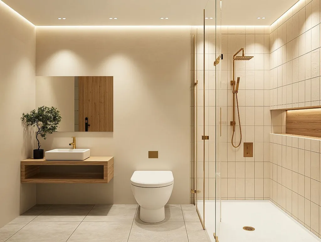 That includes home automation, installed air conditioning, a fully equipped kitchen with appliances, a complete bathroom with shower screen and LED mirror, indirect lighting, integrated designer furniture and smart storage solutions.