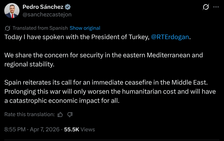 ‘Spain reiterates its call for an immediate ceasefire in the Middle East.
