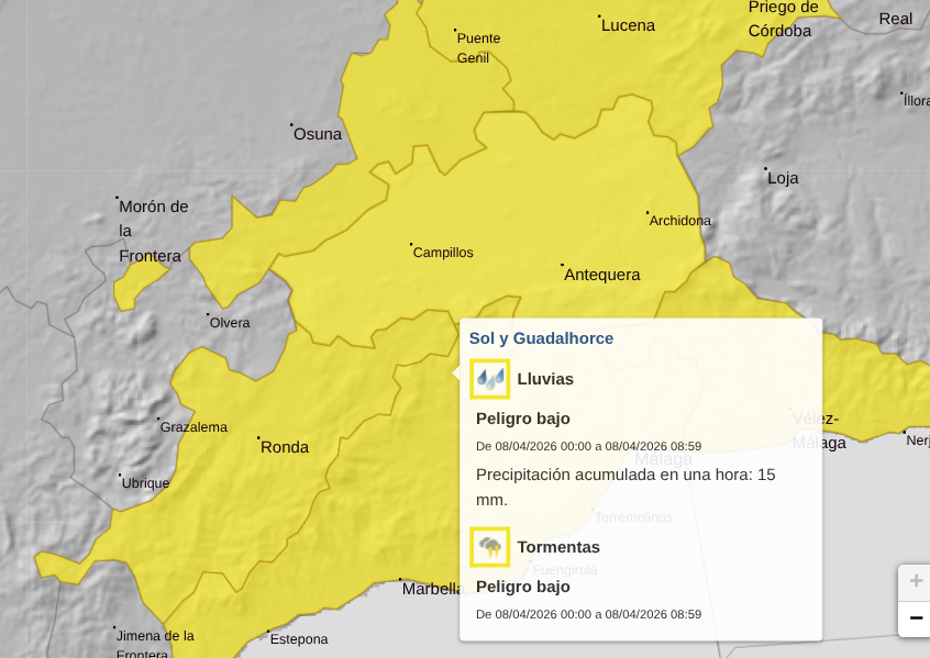 The alert is in place across the whole province – including the Costa del Sol, Axarquía, Ronda, Antequera and the Guadalhorce Valley – from midnight until 9am, when the heaviest rain is expected.